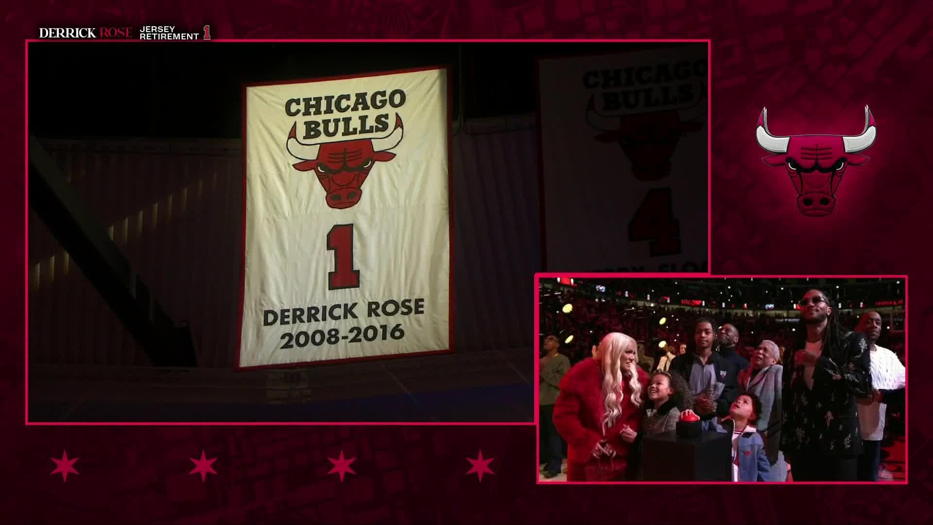Derrick Rose celebrates his Bulls jersey retirement by thanking his family and watching his No. 1 go up into the rafters.