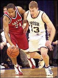 |  | | Notre Dame's Matt Carroll attempts to steal the ball away from Eugene Seals on Saturday. | The RedHawks repeatedly scored off their own misses, grabbing 18