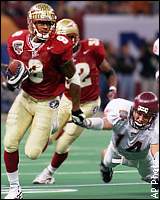 Peter Warrick hauled in a 43-yard TD catch to put FSU up by 17. The 'Noles answered Virginia Tech's 22 straight points with an 18-point burst, capped by Warrick's second TD catch.