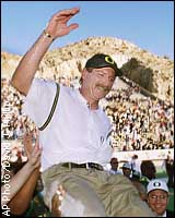 ![]() Oregon coach Mike Bellotti is carried off the field. |