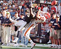 But with a little jump shot, safety Michael Dumas and the Chargers' defense saved a little face. A week after allowing Peyton Manning to throw for 404 yards, San Diego intercepted Elvis Grbac four times, two of them leading to touchdowns, and rallied from a 14-0 first-quarter deficit to beat the Chiefs 21-14. Dumas had the momentum-swinging first interception and cornerback Darryll Lewis, starting in place of injured Terrance Shaw, had two as the defense bailed out the non-existent offense. Carrying the load "is something that we're getting used to," Dumas said. "The defense is setting the tone. We played San Diego Charger defense today." Quarterback Jim Harbaugh left with a bruised right elbow late in the first quarter, and the Chargers didn't crack the 100-yard mark until the third quarter. They finished with just 132 yards, and netted only three yards on two possessions in the fourth quarter. Backup quarterback Erik Kramer threw two touchdown passes, but the Chargers had to go only 10, 18 and 22 yards on their scoring drives. The field position was courtesy of the defense and special teams. It looked like the Chargers were in big trouble when tight end Tony Gonzalez caught a 12-yard pass from Grbac for a 14-0 lead late in the first quarter. The former college basketball star celebrated by dunking the ball through the goal posts. San Diego started its comeback with an interception and 24-yard return by Dumas to the K.C. 10 with 8:03 left in the second quarter. After high-fiving fans in the end zone seats, Dumas lobbed the ball through the goal posts as if he were shooting baskets. "I was too tired to try to go for the dunk like Gonzalez does," Dumas said. "I did the next best thing. "Once the first interception came, that was a momentum-changer and we were able to regroup and the offense started controlling the ball a little better and put the points on the board," he added. Two plays later, Natrone Means broke two tackles to complete a 4-yard TD run. Lewis got his first interception after Junior Seau and Lew Bush pressured Grbac, and an unnecessary roughness call on Chiefs center Tim Grunhard moved the ball to the Kansas City 22. That set up the winning touchdown, on Kramer's 11-yard pass to Chris Penn with 10:57 to go in the third quarter. Dumas said the Chargers (2-1) match up well with Kansas City's skill players. And there was a little matter of being embarrassed by Manning and the Indianapolis Colts in a 27-19 loss in their home opener. "We knew we could play better than that," Dumas said.
