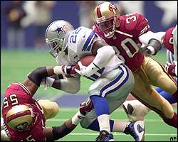 |  | | Emmitt Smith of Dallas was held to just 31 yards rushing in Sunday's loss. | This meeting was ugly and emotional. These teams were playing