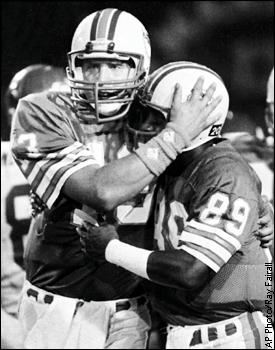 Dan Marino (left) is congratulated by teammate Nat Moore after throwing his 36th touchdown of the season to tie Y.A. Tittle's NFL record against the New York Jets on Nov. 27, 1984.