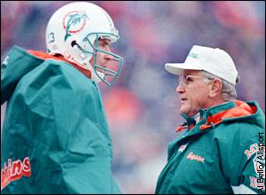 Marino (left) and head coach Don Shula confer during the third quarter of Miami's 1995 AFC wild-card loss to Buffalo at Rich Stadium. The game would be Marino's last under Shula.