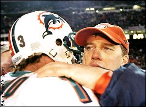 Marino congratulates fellow Class of '83 alum John Elway (right) after Miami's 38-3 loss to Denver in the 1998 AFC playoffs. Elway would go on to win another Super Bowl title, a feat Marino never got to experience. ![]() | ALSO SEE Marino photo gallery | |||||