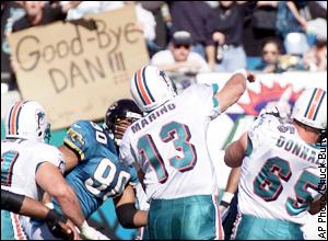 These Jacksonville fans must've been clairvoyant by bidding adieu to Marino (13) in the first half of Miami's nightmarish 62-7 loss to the Jaguars in the 1999 AFC divisional playoffs.