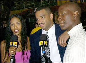 ESPN's Stuart Scott takes time out to take a picture with MTV v-jays Ananda Lewis and Tyrese.