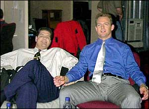 Mike Golic and Merril Hoge take a breather during their coverage of the Super Bowl.