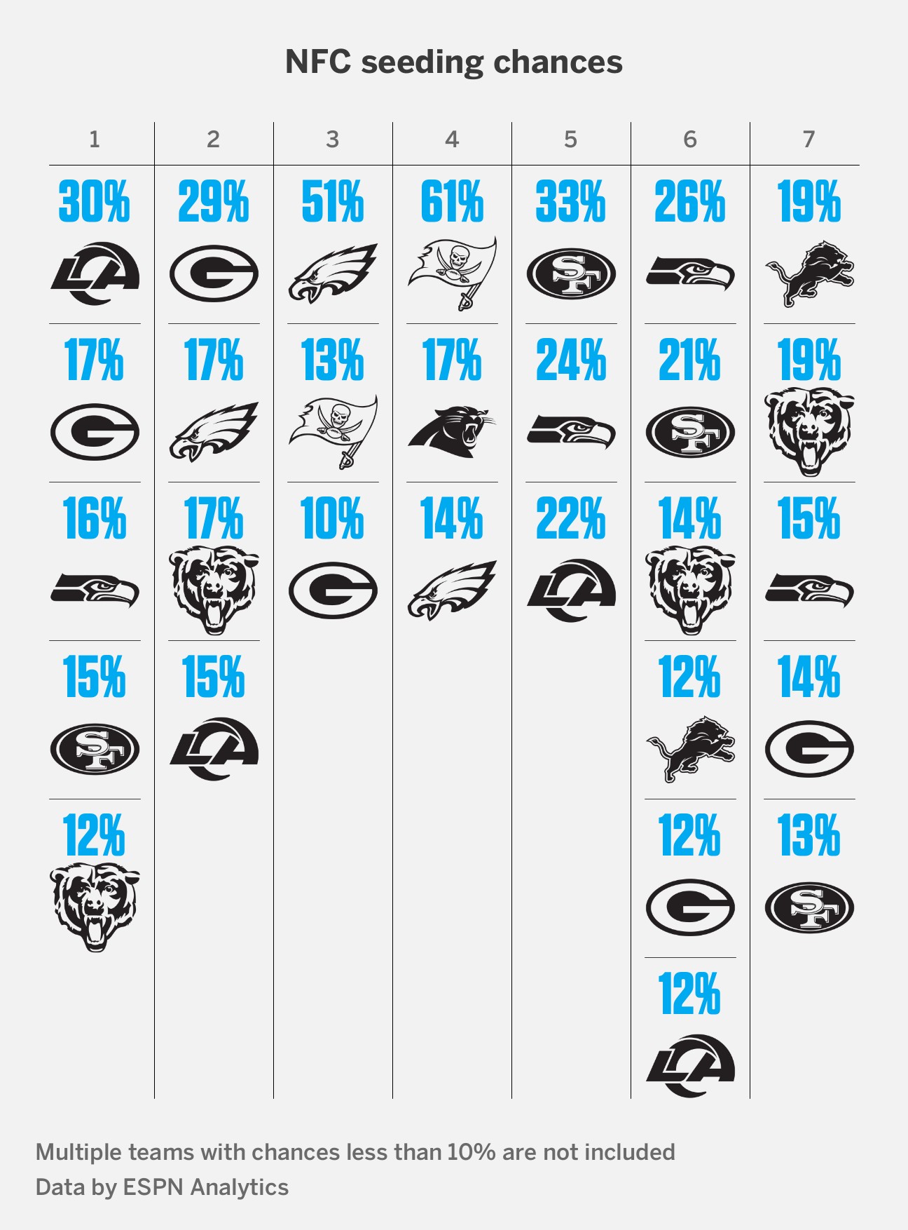 The Bears might be the 1-seed in the NFC in the standings through Week 13, but our projections say four teams have a better chance of ultimately getting the first-round bye.