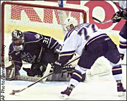 Palffy, obtained in an offseason trade with the New York Islanders, scored his first goal for the Kings and added an assist as Los Angeles defeated the St. Louis Blues 3-2 Monday night. "What I saw from Ziggy again tonight was his ability to get in behind the other team's defense," said Los Angeles coach Andy Murray. "I'm sure (Blues coach) Joel Quenneville told his guys you've got to be aware of Palffy getting in behind you. But I used to tell guys that on Team Canada all the time and he still did it." After the Blues scored to take a 2-1 lead at 11:19 of the second period, Murray called a timeout. Six seconds later, Palffy tied it when he skated around defenseman Chris Pronger and beat goalie Roman Turek. "We told him to score a goal during that timeout and he did," Murray said with a laugh. "We felt we had to break the momentum a little bit that they were carrying and we had to get smarter. I felt we played a lot better after the timeout." Palffy thought his first goal as a King came at just the right time. "It felt great, because it tied the game and everyone was back on the tracks," Palffy said. "It was an important goal for us." Luc Robitaille scored the go-ahead goal on a breakaway in the third period. The score moved him into sole possession of 22nd place on the career goal-scoring list with 519. Rob Blake also scored for the Kings, and Stephane Fiset made 36 saves as Los Angeles improved to 2-0 on its season-opening, seven-game road trip. It was a rare victory in St. Louis for the Kings, who are 2-9-3 in their last 14 visits to the Kiel Center. "I think that's my first win here," Fiset said. "We talked about it before the game and we said it's a new season, and we have to forget what happened in the past." The Blues were impressed with Fiset. "He's a big goalie and he's strong," said St. Louis left wing Geoff Courtnall. "We didn't bear down on the rebounds we had in front of the net. He was lying down after stopping the first shots and we couldn't put the rebound over him." Pavol Demitra and Michal Handzus scored for the Blues, who fell to 0-2. "We generated a lot of opportunities but we didn't finish them off," Quenneville said. "We're going to start all over in Calgary Wednesday night." Robitaille scored the decisive goal at 14:25 of the third when Blues defenseman Chris McAlpine misplayed the puck at his blue line, allowing Robitaille to break in alone on Turek. Robitaille beat Turek with a wrist shot from between the circles for his second goal of the season. Demitra scored at 8:15 of the second period when he stole a clearing attempt by Kings defenseman Aki Berg in the right circle and blasted it past Fiset. Demitra's goal ended a shutout string for Fiset, who blanked Nashville 2-0 in the Kings' season opener Saturday. The Blues took a 2-1 lead at 11:19 of the second period when Handzus scored off his own rebound. Blake scored the Kings' first goal on a two-man advantage 10:50 into the game. | ALSO SEE NHL Scoreboard Los Angeles Clubhouse St. Louis Clubhouse RECAPS Toronto 4 Boston 0