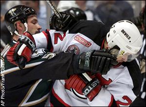 Dallas Stars defenseman Sergei Zubov gives New Jersey Devils right winger Claude Lemieux a shot in the face during a scuffle in first period of Game 2.