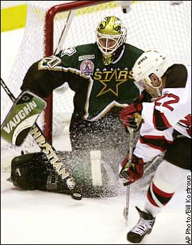 Dallas Stars goalie Ed Belfour makes a save on a shot by New Jersey Devils' Claude Lemieux during the first period of Game 2 of the Stanley Cup Finals.