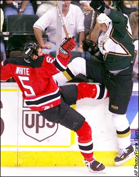 Darryl Sydor, right, hammers Colin White with a hit during first period NHL Stanley Cup game 3 action.