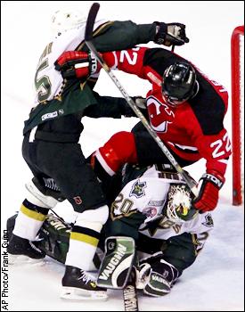 Darryl Sydor sends New Jersey Devils right winger Claude Lemieux tumbling over Stars goaltender Ed Belfour. ![]() |