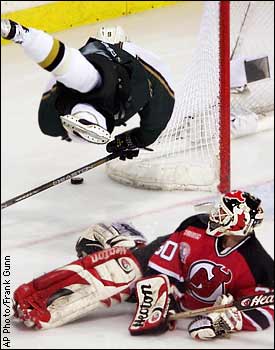 New Jersey Devils goaltender Martin Brodeur (30) sends Dallas Stars centre Mike Modano (top) flying as he knocks him off the puck while making a save during first period Stanley Cup game 4 action in Dallas, TX on Monday.