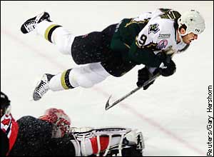 Dallas Stars' center Mike Modano flies over New Jersey Devils' goalie Martin Broduer after being knocked from his skates while attempting a shot against Broduer during first period action in Game 4 of the Stanley Cup Finals.
