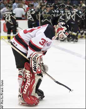 It's not over yet New Jersey Devils goaltender Martin Brodeur hangs his head as he skates off the ice. Behind him the Dallas Stars celebrate Mike Modano's game-winning goal during the third overtime period of Game 5 of the Stanley Cup Finals.
