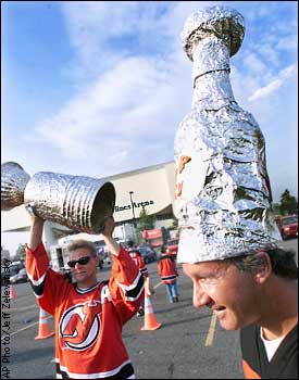 Those Kooky Fans Tom Osadacz, right, from Sayreville, N.J. and Ken Peslin from Trenton, N.J., display their mock Stanley Cups as they wait in the parking lot outside the Continental Airlines Arena in East Rutherford, N.J., before Game 5 of the Stanley Cups Finals.