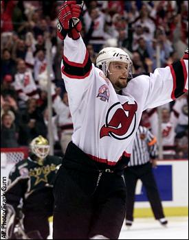 Dallas Stars goaltender Ed Belfour sits dejectedly in his crease as New Jersey Devils center Petr Sykora celebrates his goal during the third period of Game 1's Stanley Cup Final.
