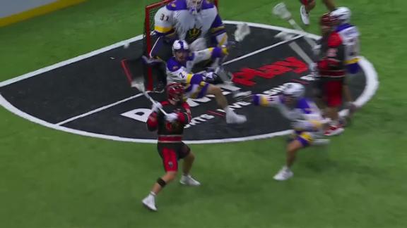 Jake Boudreau gets his shot off just in time to bring the Rush level with 0.9 seconds left on the clock before halftime vs. the Bandits.