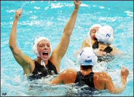 |  | | Members of the Australian women's water polo team celebrate their amazing last-second victory over the U.S. |