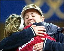 |  | | Jennifer McFalls, who scored the winning run over Australia, hugs teammate Christie Ambrosi after the 1-0 victory by the U.S. put them in the gold-medal game.