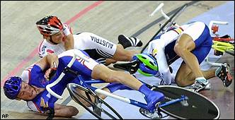 Accident scene Great Britain's Rob Hayles crashed with the Austrian team of Werner Riebenbaur and Roland Garber during the final of the men's Madison cycling event.