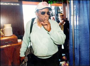 Hall of Famer Willie Mays requests some quiet as he sneaks up on his former teammates Orlando Cepeda and Willie McCovey as they visit the Dan Patrick show in San Francisco.