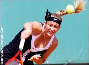 France's Mary Pierce serves during her match against compatriot Virginie Razzano in the French Open. Pierce won 6-4 6-0.