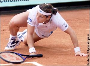 Spain's Arantxa Sanchez-Vicario falls during her match against Austria's Barbara Schett in the French Open. Sanchez-Vicario defeated Schett 0-6 6-4 6-2.
