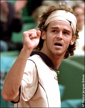 Fifth-seeded Gustavo Kuerten reacts after he defeated fourth-seeded Yevgeni Kafelnikov, 6-3, 3-6, 4-6, 6-4, 6-2, during their quarterfinals match at the French Open tennis tournament at Roland Garros stadium.