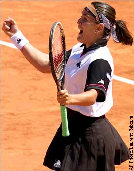Fifth-seeded Conchita Martinez of Spain reacts after she defeated her fellow Spaniard eighth-seeded Arantxa Sanchez-Vicario 6-1, 6-2, during their semifinals match at the French Open. Martinez will face Mary Pierce in the finals.