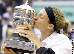 Mary Pierce kisses the cup after winning her match against Conchita Martinez in the final of the French Open. Pierce defeated Martinez 6-2 7-5.