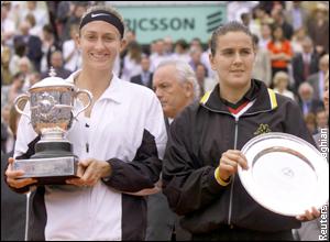 Mary Pierce, left, and Conchita Martinez hold their trophies after the final of the French Open. Pierce defeated Martinez 6-2 7-5.