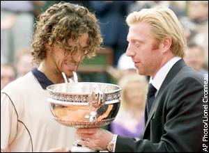 Retired German tennis star Boris Becker presents the trophy to Gustavo Kuerten after he defeated Magnus Norman 6-2, 6-3, 2-6, 7-6 (8-6) , to win the final at the French Open.