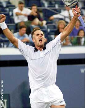 Todd Martin celebrates after beating Greg Rusedski in a long five-set match Martin won 5-7, 0-6, 7-6, 6-4, 6-4.