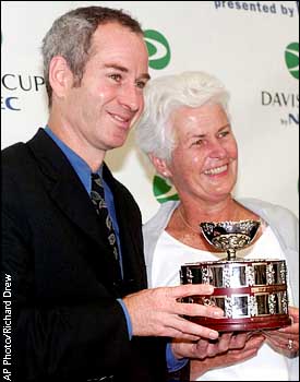 John McEnroe holds a miniature replica of the Davis Cup with USTA President Judy Levering during a news conference at the U.S. National Tennis Center. McEnroe was named captain of the American Davis Cup team. He succeeds Tom Gullikson, who held the post for six years.