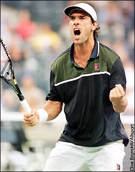 Cedric Pioline celebrates his win over Gustavo Kuerten in their quarterfinal match. Pioline beat Kuerten 4-6, 7-6 (8-6), 7-6 (16-14), 7-6 (10-8). The match lasted nearly 31/2 hours.