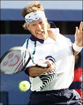 Slava Dosedel, of the Czech Republic, returns the ball to Jim Courier at the U.S. Open Tuesday, in New York. Slava was defeated 6-2, 6-2.