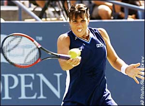 Jennifer Capriati, of Wesley Chapel, Fla., returns the ball to Iva Majoli, of Croatia, at the U.S. Open in New York. Capriati won 6-1, 7-5.
