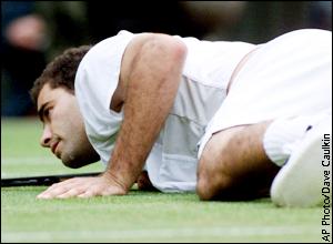 Defending champion Pete Sampras lies on the ground, after falling during second round match against Karol Kucera of Slovakia.