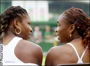 Venus Williams, right, has a sisterly chat with Serena Williams during their doubles match against Cara Black and Irina Selyutina. The sisters won 6-3, 6-2.