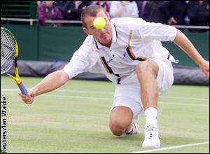 Martin Damm of the Czech Republic plays a low volley against Marat Safin of Russia. Damm defeated Safin 7-5, 7-6 (4), 6-3.