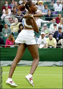 Venus Williams makes the backhand return during first-round Wimbledon action on her way to a victory over Kvetoslava Hrdlickova.