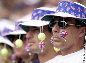 British fans wear their national colours as they watch Tim Henman play Mark Philippoussis of Australia during the fourth-round.