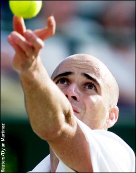 Andre Agassi of the United States tosses the ball up to serve against David Prinosil of Germany during their fourth-round match. Agassi won the match 6-4 6-3 6-3.