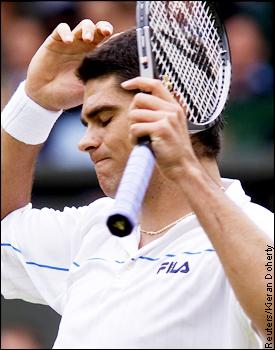 Mark Philippoussis of Australia reacts after losing a point to Andre Agasi of the United States. Agassi won the match 7-6 6-3 6-4.