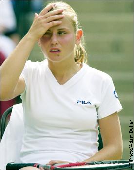 Jelena Dokic of Australia holds her head during a break in her semifinal match against defending champion Lindsay Davenport. Davenport won the match 6-4, 6-2.