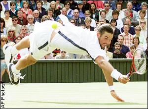 Patrick Rafter of Australia dives to return a shot from Andre Agassi. Rafter won the match 7-5, 4-6, 7-5, 4-6, 6-3 to reach the final.