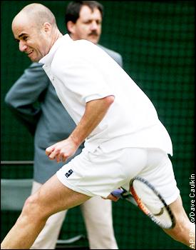 Andre Agassi of the United States grimaces as he attempts a shot between his legs, during his semifinal match against Patrick Rafter of Australia. Rafter won the match 7-5, 4-6, 7-5, 4-6, 6-3.
